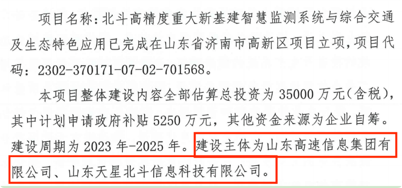 2023年5月国家发展改革委批复了北斗产业重大工程项目其中包括山高北斗重大项目,项目主管单位为山东省发改委,项目法人主体为山高信息集团。国家发展改革委批复项目总投资3亿元,中央预算内资金4500万元。