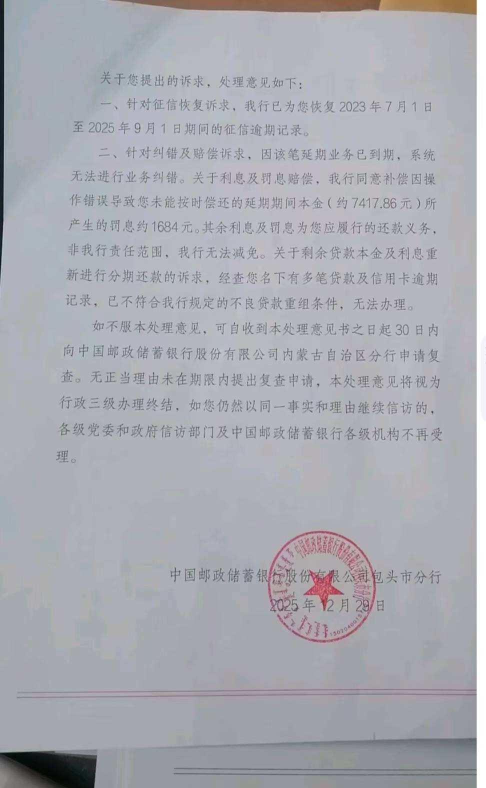 2025年11月,王小明提交信访材料后,于12月29日收到邮储银行包头分行出具的《信访事项处理意见书》。文件中明确“你反映的情况属实”,在征信修复方面,银行已为其恢复2023年7月1日至2025年9月1日的逾期记录。但其他处理方案仍延续“将错就错”的态度,让王小明无法接受。