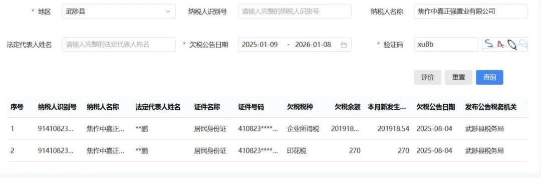除了自身面临诸多风险,武陟中嘉集团投资的多家子公司也存在问题,不少子公司因拖欠税款而被列入欠税名单。例如,武陟中嘉集团持股35%的焦作中嘉正强置业有限公司,国家税务总局电子税务局官网显示,2025年8月4日武陟县税务局披露,焦作中嘉正强置业有限公司存在企业所得税、印花税欠缴情形,两项欠税余额分别为201918.54元、270元,合计欠税近20.22万元;再如,武陟中嘉集团持股24%的焦作市中嘉乐筑混凝土有限公司,2025年1月9日武陟县税务局披露,焦作市中嘉乐筑混凝土有限公司存在城镇土地使用税欠缴情形,欠税余额为29573.73元。