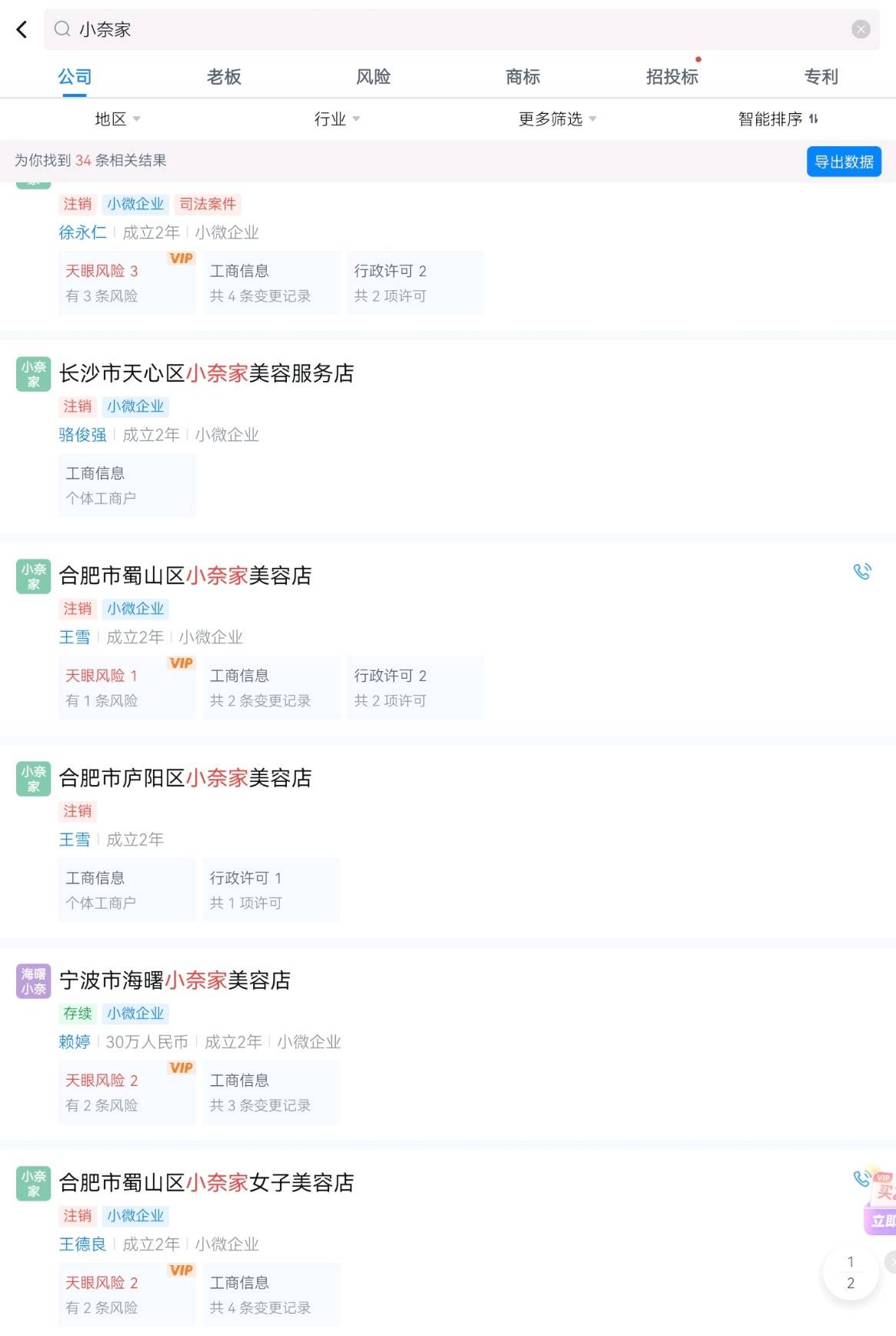更耐人寻味的是,深度美业查询了大众点评上小奈家美肌管理(西安未央路店)的经营资质,其法定代表人姓名与已经注销的合肥市蜀山区、庐阳区小奈家美容店的法定代表人姓名相同。