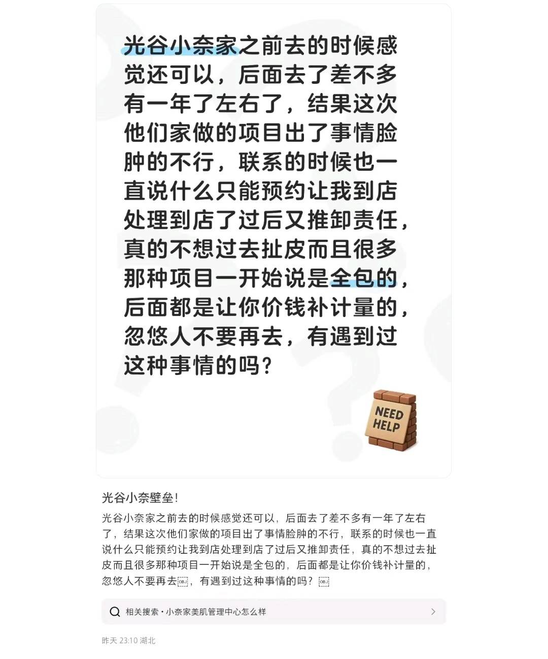 1月11日,深度美业发现,有网友在小红书上发文称其之前去武汉光谷小奈家消费一年左右后,她做的项目出了问题,导致脸部肿胀。