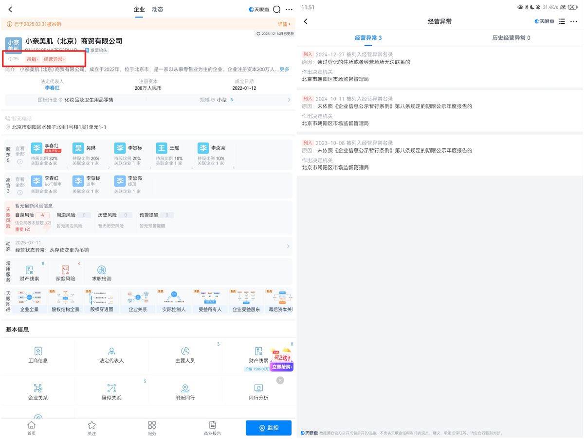 查询天眼查后,深度美业发现,李某某早前创立的小奈美肌(北京)商贸有限公司已于去年3月21日被吊销,曾三次被列入经营异常。
