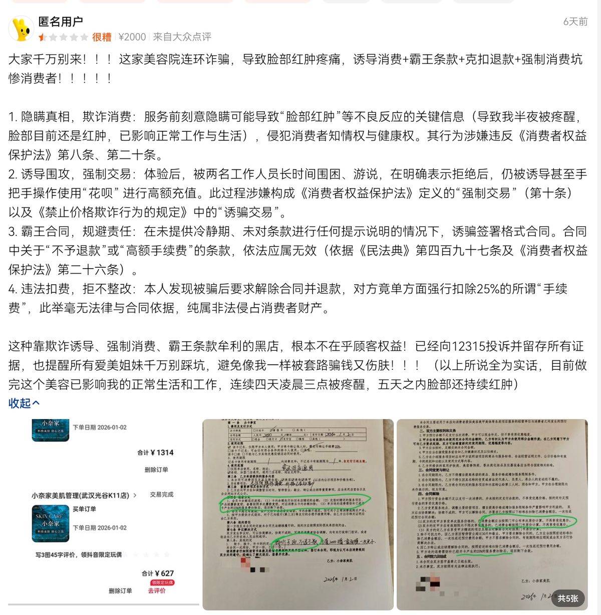 以美团上小奈家美肌管理(武汉光谷K11店)为例,有消费者于1月6日曝光了该机构存在的诸多问题。