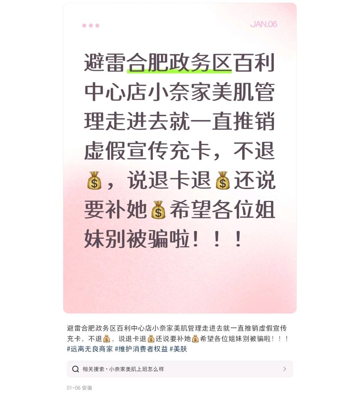 1月6日,另一位网友同样在小红书发布内容提醒网友们避雷合肥政务区百利中心店小奈家美肌管理。该网友称其走进该店就一直被推销,存在虚假宣传充卡情况且拒绝退款。该机构表示,退卡退钱,需要让该网友补钱。