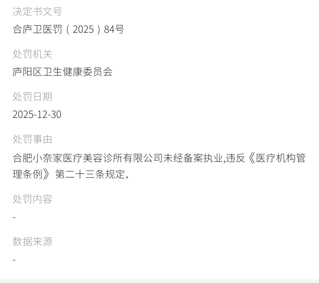 去年12月30日,合肥小奈家医疗美容诊所因未经备案执业,被合肥市庐阳区卫生健康委员会立案调查并处以5000元行政处罚罚款。