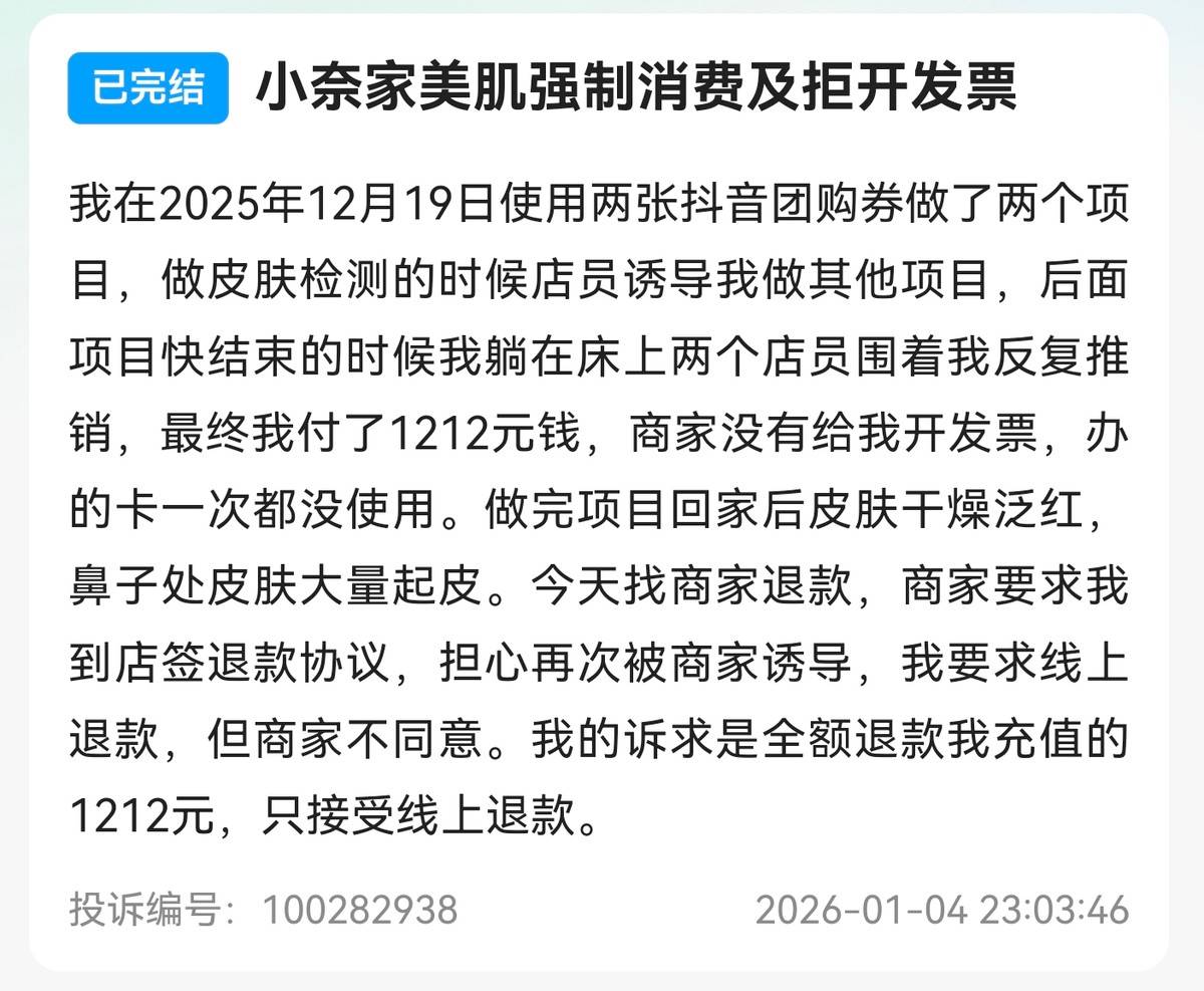 该消费者指出,做完项目回家后该消费者皮肤干燥泛红,鼻子处皮肤大量起皮。联系该机构退款时,该机构要求消费者到店签退款协议,该消费者担心再次被诱导,便要求线上退款,遭到拒绝。该消费者的诉求是全额退款该消费者充值的1212元,只接受线上退款。截至深度美业发稿前,该投诉已于1月5日由消费者申请完结。