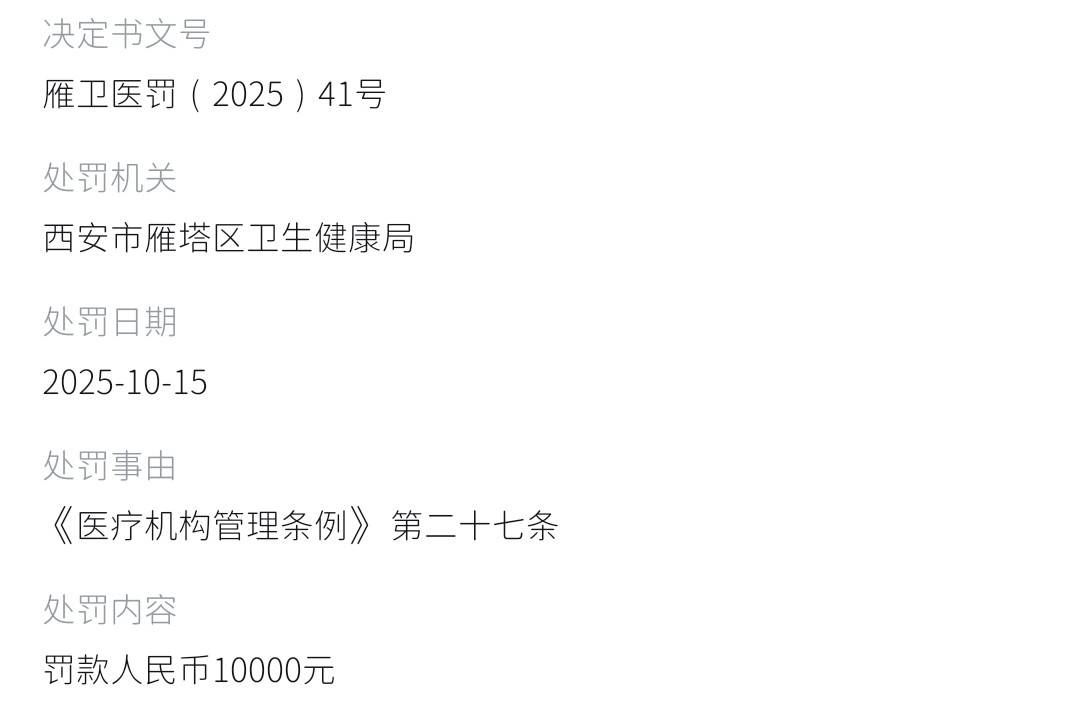 去年10月15日,西安曲江新区小奈家医疗美容诊所因存在使用非卫生技术人员为患者开展诊疗活动,被西安市雁塔区卫生健康局处以行政处罚,罚款金额10000元。