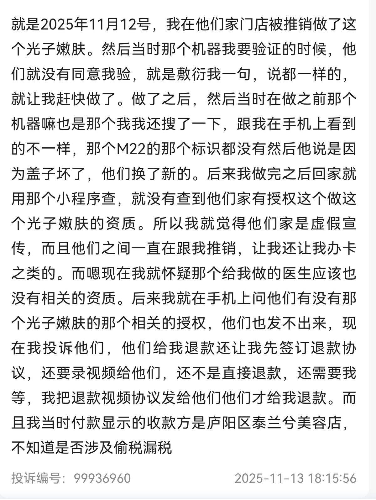 该消费者还提到,项目过程中,工作人员一直向其推销办卡。该消费者还怀疑为其做项目的医生没有相关资质。后来该消费者在手机上询问商家有无光子嫩肤的相关授权,该机构无法提供。该消费者投诉后,该机构给予退款却要求其先签订退款协议,还需录制视频发送给后才退款。当时付款显示的收款方是庐阳区泰兰兮美容店,该消费者不知此事是否涉及偷税漏税。截至深度美业发稿前,该投诉已于11月16日由涉事机构进行了赔偿。
