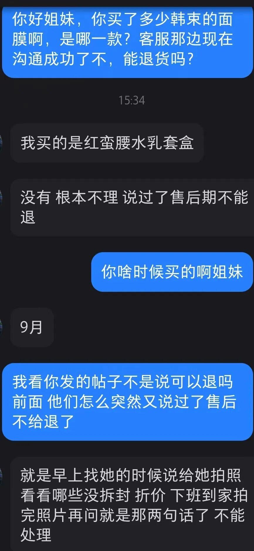 另一位消费者也表示,自己买了40片韩束面膜,至今没能退货成功。
