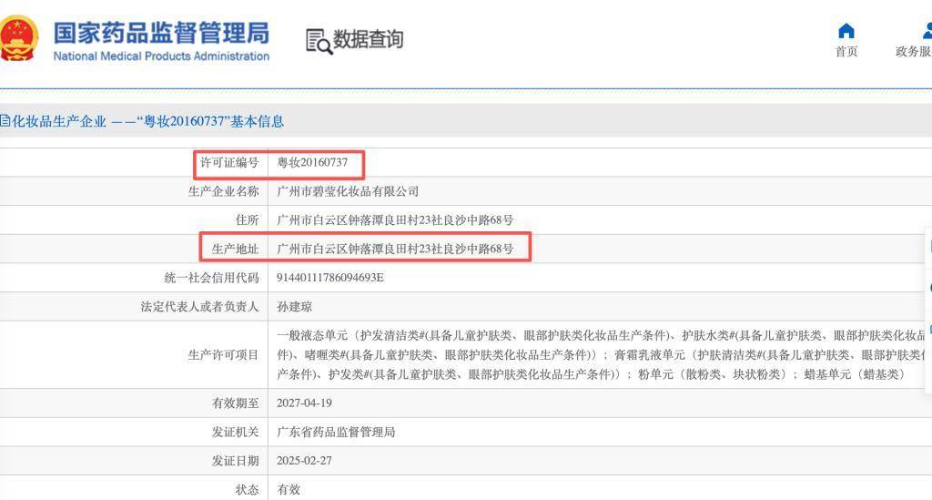 根据该网友提供的产品标注的许可证编号(粤妆20160737),澎湃新闻在国家药品监督管理局平台查询确认,该产品的生产地址为广州市白云区钟落潭良田村23社良沙中路68号,与“澳洲产地”说法不符。