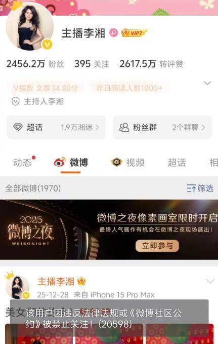 李湘多平台账号被禁止关注:因违反法律法规或社区公约被禁止