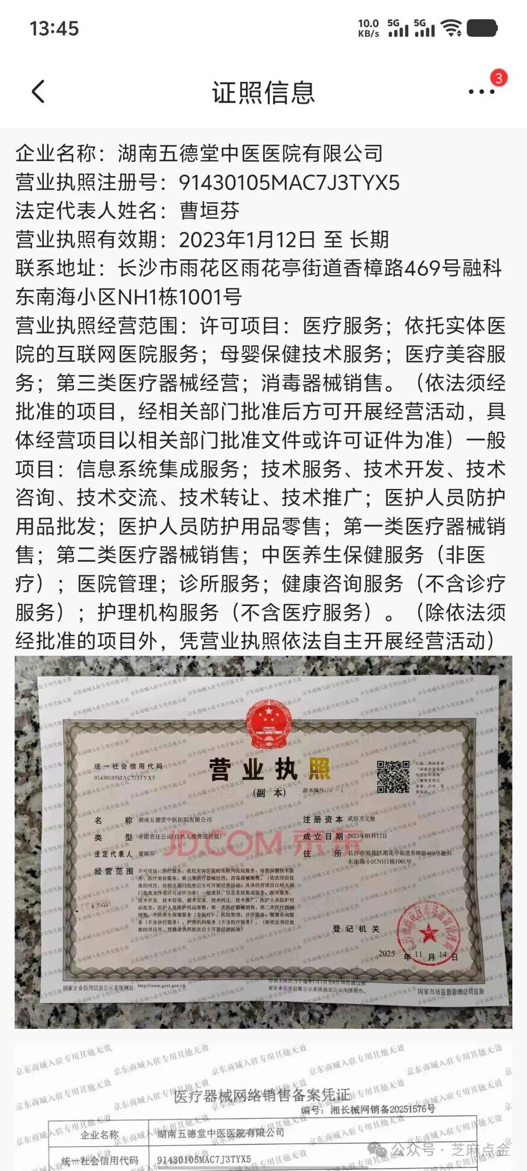 该公司注销了原主体,随后以“湖南五德堂中医医院有限公司”和“长沙苗三良健康管理有限公司”的名义,在天猫和京东平台上“换装重生”,继续销售同类产品。两家新公司的法定代表人均为同一人——曹垣芬,而公司内部人员也向记者承认,这“还是原来的团队”。