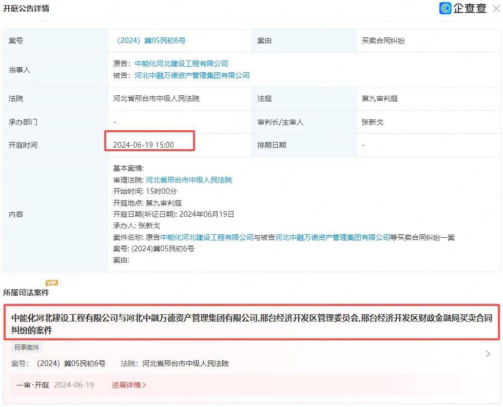 截至目前,在中国裁判文书网等公开渠道暂未查询到河北中融集团与中能化河北之间纠纷的详细法律文书,但企查查开庭公告显示,双方纠纷或源于买卖合同案件。