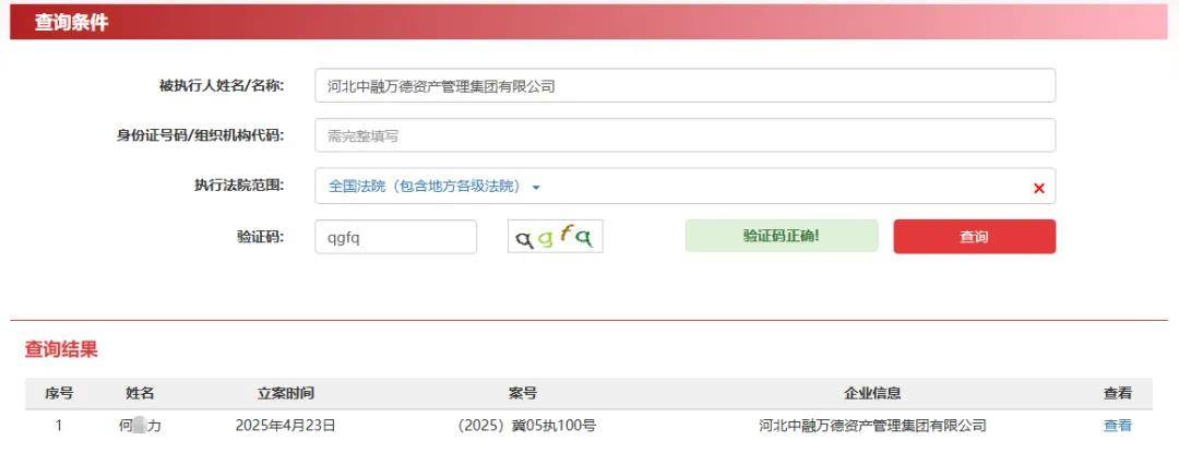 中国执行信息公开网信息,2026年1月6日,邢台市中级人民法院将河北中融集团列为被执行人,被执行金额1.6亿元,案号为(2026)冀05执恢4号。