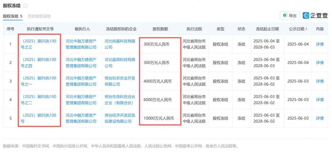 具体来看,河北中融集团所持邢台经济开发区凯投建设有限公司1亿元股权、邢台先导科技合伙企业(有限合伙)6,000万元股权、邢台旺农农业开发有限公司4,000万元股权,冻结期限均为2025年6月3日至2028年6月2日。此外,河北中融集团所持河北裕嘉科技有限公司、河北霆邦科技有限公司各300万元股权,亦被司法冻结,冻结期限为2025年6月4日至2028年6月3日。