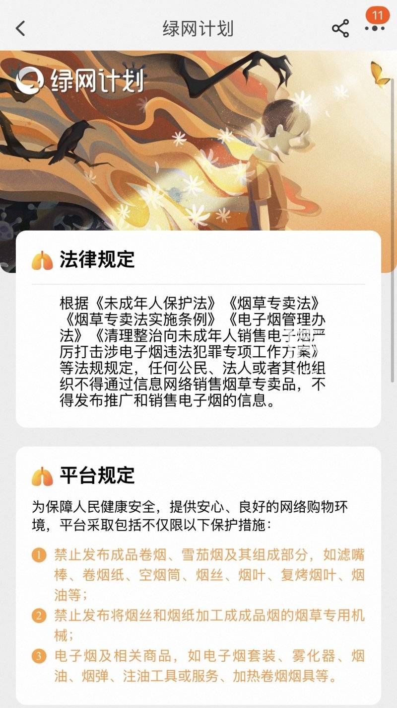 信号新闻了解到,香烟和电子烟产品,在正规购物平台上均属禁售产品。在天猫搜索“电子烟”,会立即跳转至“绿网计划”页面,内容援引《中华人民共和国未成年人保护法》《中华人民共和国烟草专卖法》《电子烟管理办法》等多部法规,强调“任何公民、法人或者其他组织不得通过信息网络销售烟草专卖品,不得发布推广和销售电子烟的信息”。天猫平台将电子烟套装、雾化器、烟油、烟弹、注油工具等全品类电子烟相关商品纳入禁售清单。