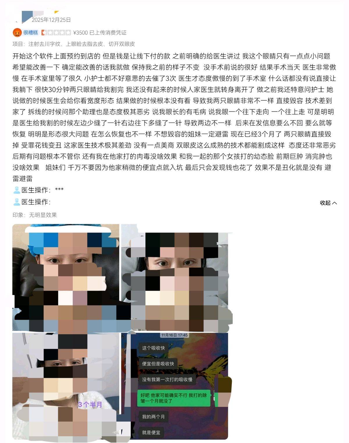 该消费者还提到,后来,她发信息询问情况时,对方要么不回要么就说等恢复。术后3个月过去,该消费者认为自己的两只眼睛直接毁掉。她认为该机构的医生技术极其差劲,没有审美,双眼皮这么成熟的技术都能如此失败,态度还非常恶劣。