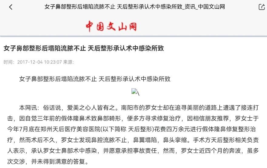 2017年12月4日中国文山网发布一则资讯显示,南阳市的罗女士因三年前假体隆鼻手术导致鼻部畸形,为修复鼻部,她经朋友推荐,于2017年7月底在郑州天后医疗美容医院花费四万余元进行假体隆鼻修复整形治疗。术后不久,罗女士出现鼻腔流脓不止、鼻翼塌陷、鼻头挛缩等情况,医院相关负责人承认罗女士鼻部术中感染并愿意承担责任,但近四个月里罗女士多次交涉都未得到满意答复。