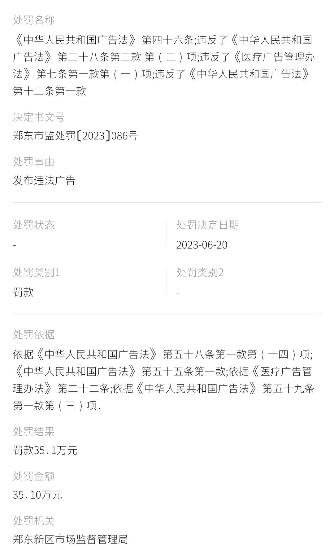2023年6月20日,郑州市郑东新区市场监督管理局对该机构进行了行政处罚。该机构因发布违法广告,违反了《中华人民共和国广告法》第四十六条、第二十八条第二款第(二)项、《医疗广告管理办法》第七条第一款第(一)项以及《中华人民共和国广告法》第十二条第一款,被处以罚款35.1万元。