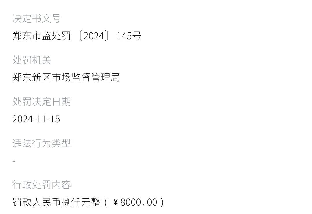 天眼查显示,2024年11月,郑东新区市场监督管理局对郑州天后医疗美容医院有限公司进行了罚款8000元的行政处罚。