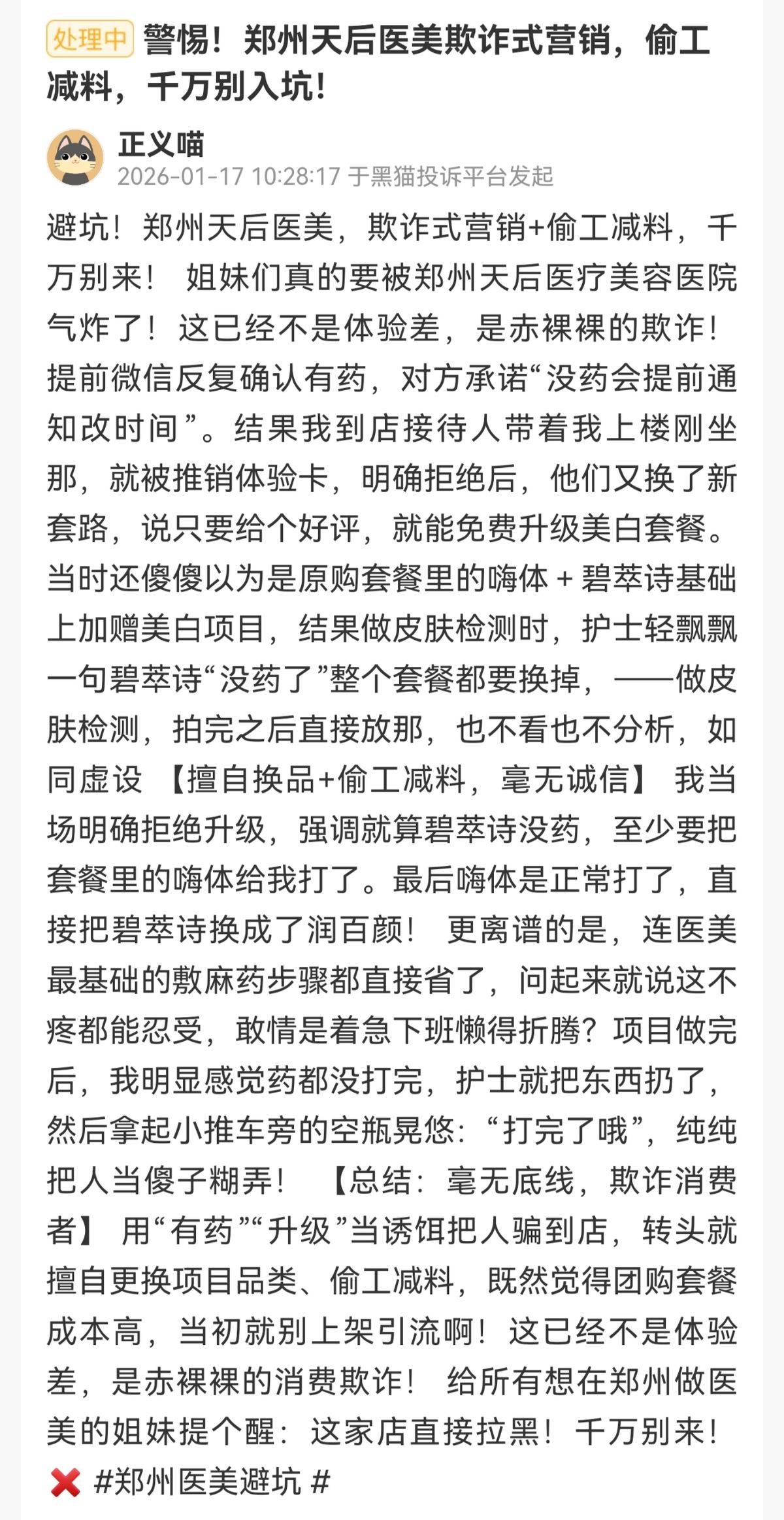 1月17日,一消费者在黑猫投诉平台上投诉称郑州天后医美存在欺诈式营销、偷工减料情况,千万别入坑!