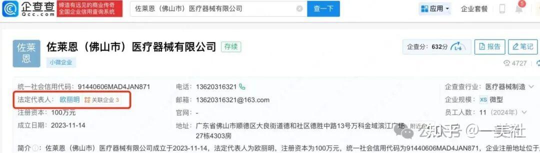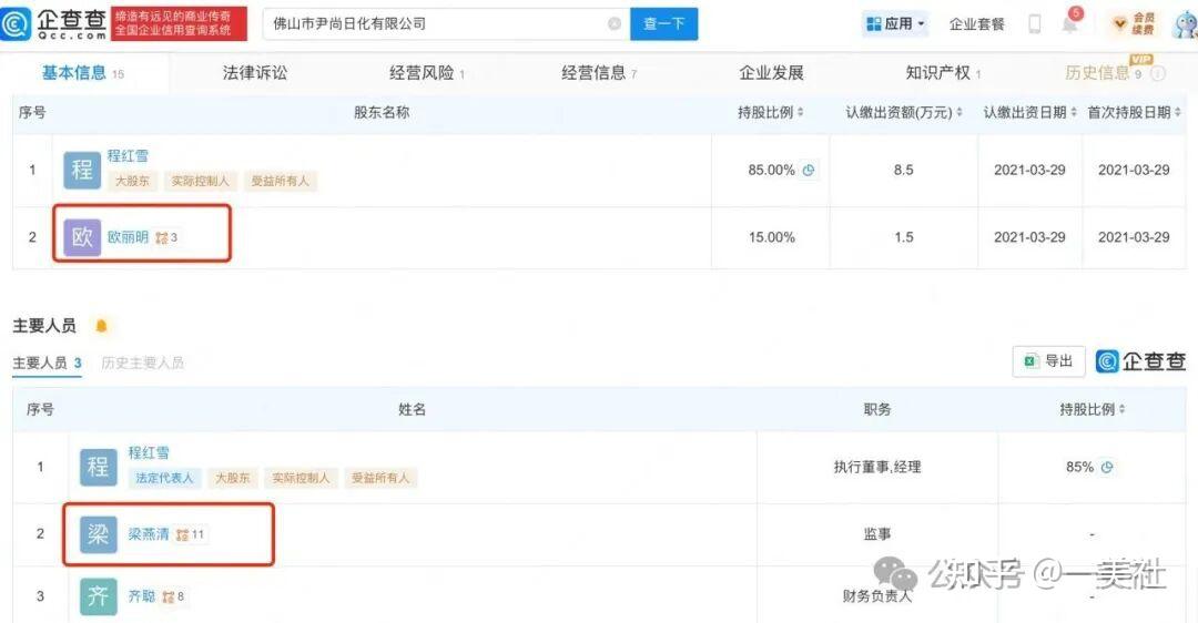 一美社发现,企查查显示,佛山尹尚日化的原监事梁某早在2023年5月就成立了轻美原(广州)医疗管理有限公司,以及在2023年6月成立了佛山轻美原医疗美容有限公司;佛山尹尚日化的原股东欧某同时担任现在的佐莱恩(佛山市)医疗器械有限公司的法人。
