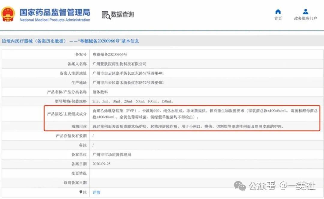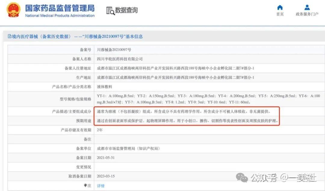 此外,“CF青春支架”已于2023年3月15日取消备案,其产品描述显示“所含成分不可被人体吸收。非无菌提供”,备案用途是“通过在创面表面形成保护层,起物理屏障作用。用于小创口、擦伤、切割伤等浅表性创面及周围皮肤的护理”,未达到注射、侵入性操作的无菌安全标准,存在引发皮肤刺激、感染等安全风险。