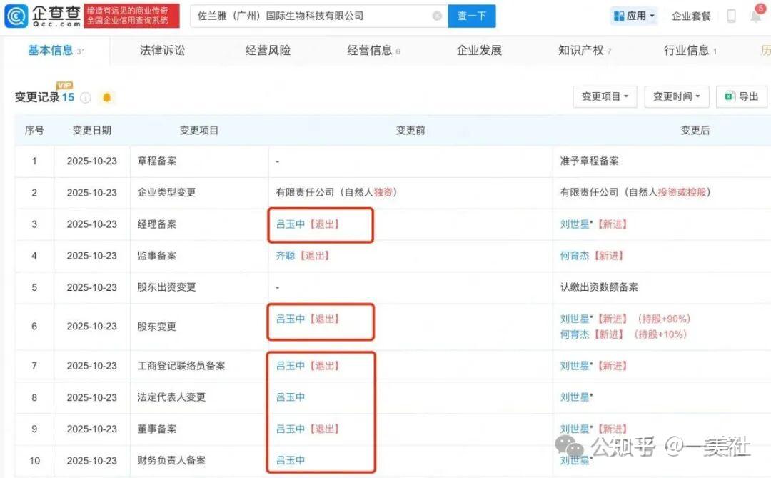 消费者陈某最初接触的佛山尹尚日化已于2023年11月注销;佐兰雅(广州)国际生物科技有限公司旗下的佛山市顺德区佐兰雅医疗美容诊所有限公司,也在2024年5月办理了注销手续;2025 年 10 月,佐兰雅公司本身还发生了股东变更,进一步淡化旧主体痕迹。值得注意的是,原运营团队并未退出市场,而是通过成立新公司的方式另起炉灶重启业务。