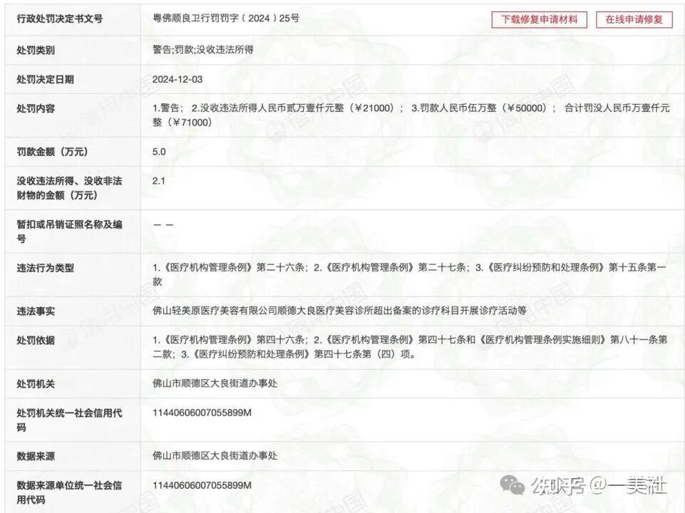 2024年12月3日,佛山轻美原医疗美容有限公司顺德大良医疗美容诊所因存在超出备案的诊疗科目开展诊疗活动等违法行为,被相关监管部门给予警告、没收违法所得2100元、罚款50000元的行政处罚。