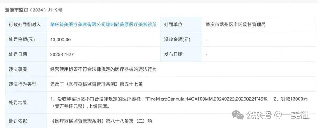 2025年1月27日,肇庆市端州区市场监督管理局经过核查,认定肇庆轻美医疗美容有限公司端州轻美原医疗美容诊所(以下简称“端州轻美原医美”)存在“经营使用标签不符合法律规定的医疗器械“的违法行为。因该行为违反《医疗器械监督管理条例》第五十七条规定,故对该诊所作出没收涉案的“Fine MicreCannula,14G×100MM,20240222,20290221”46包医疗器械、罚款13000元的行政处罚。