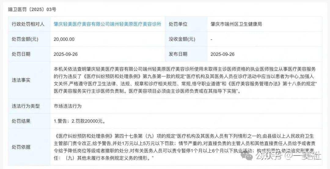 此外,2025年9月26日,经肇庆市端州区卫生健康局核查认定,肇庆轻美医疗美容有限公司端州轻美原医疗美容诊所存在使用未取得主诊医师资格的执业医师独立从事医疗美容服务的违法行为,警告、罚款20000元的行政处罚。