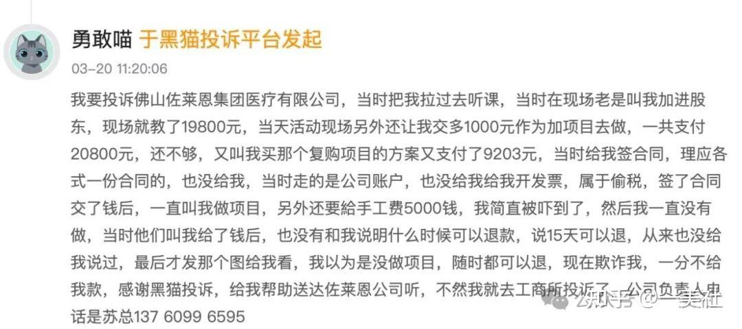 此外,黑猫投诉显示,佛山佐莱恩集团医疗有限公司(以下简称“佛山佐莱恩”)存在诱导消费、违规收费、不提供合同与发票、涉嫌偷税以及拒绝退款等问题。有消费者反映,自己被该公司拉去听课,“当时在现场老是叫我加进股东,现场就教了19800元,当天活动现场另外还让我交多1000元作为加项目去做,一共支付20800元,还不够,又叫我买那个复购项目的方案又支付了9203元”;在签约付款后,“理应各式一份合同的,也没给我,当时走的是公司账户,也没给我给我开发票,属于偷税”;后续对方还要求支付5000元手工费,让用户因害怕而未开展项目,而申请退款时,对方“当时他们叫我给了钱后,也没有和我说明什么时候可以退款,说15天可以退,从来也没给我说过,最后才发那个图给我看,我以为是没做项目,随时都可以退,现在欺诈我,一分不给我款”。