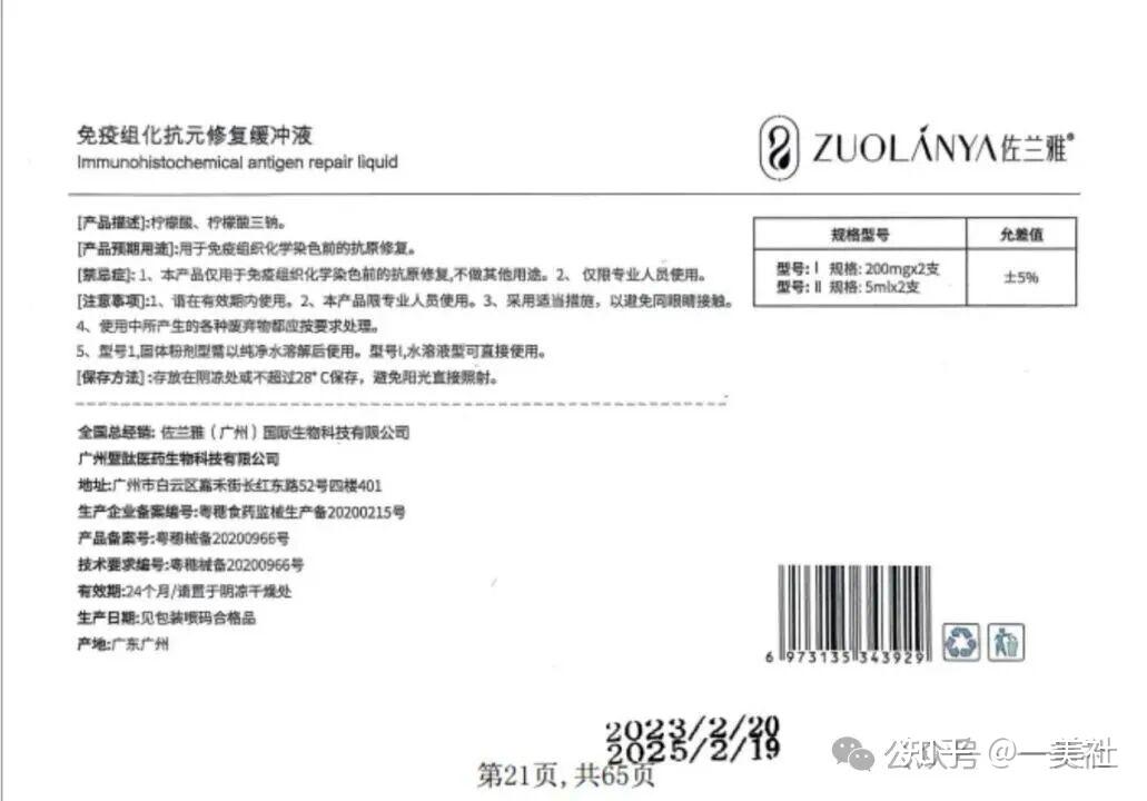 国家药监局的境内医疗器械(备案历史数据)显示,免疫组化抗原修复缓冲液的预期用途为“通过在创面表面形成膜状保护层,起物理屏障作用。用于小创口、擦伤、切割伤等浅表性创面及周围皮肤的护理”且非无菌提供,仅对微生物限度作出要求,无法满足注射所需的无菌标准,禁止用于注射等侵入性操作。该产品本质为体外诊断实验用试剂,备案用途不包含皮肤抗衰、美容等功效,亦不可用于完整皮肤或非创面皮肤的涂抹使用,其使用范围严格限定于浅表性创面护理。