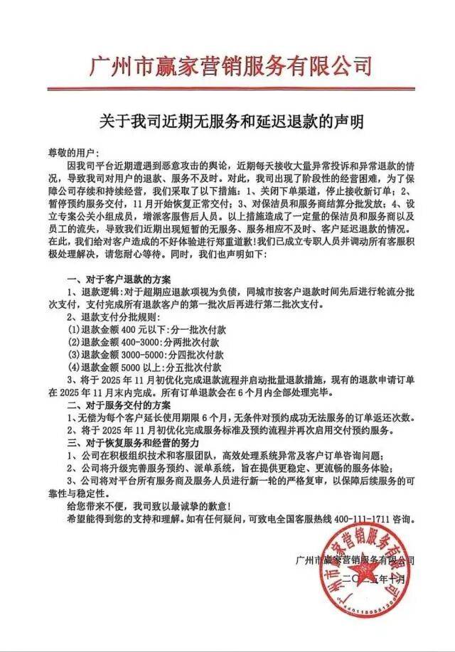 记者在消费者提供的材料中看到,柴米家政的运营公司为广州市赢家营销服务有限公司,位于南沙区,其曾发布声明,称因遭遇“恶意攻击的舆论”和“大量异常投诉退款”导致经营困难,宣布关闭下单渠道、暂停预约服务,并制定了分批次退款方案:400元以下一次付清,400元—3000元分两批次,3000元—5000元分四批次,5000元以上分五批次,承诺2025年11月初启动批量退款,6个月内处理完毕,同时将服务期限延长6个月。