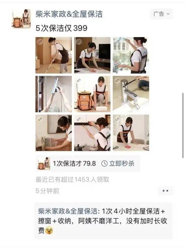 爆料人杜女士介绍,去年8月,她看到微信朋友圈频繁推送的家政服务广告,其中“5次保洁399元”“单次79.8元”等优惠力度吸引了她。因即将搬家,她需要频繁保洁,直接购买了价值2000余元的年卡。“购买当月我成功预约了两名阿姨上门服务,当时觉得服务靠谱,完全没考虑到风险。”杜女士说。