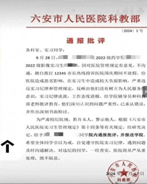 此外,2024年9月,该院因国庆期间不放假被实习生投诉,进而对实习生通报批评的事件,也曾引发网友热议。