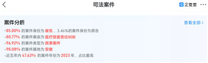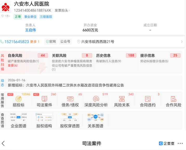 企查查数据显示,六安市人民医院目前共有260例司法案件,其中85.00%的案件中该院为被告,80.77%的案件案由为医疗损害责任纠纷,96.92%为民事案件。近五年内的案件中,2023年占比高达47.62%,为历年最高。此外,医院还存在行政违法记录:2025年9月17日,因“未按规定填写病例资料”被六安市卫健委处罚35000元;同年10月23日,因“未办理规划审批手续擅自建设”被六安市城管局处罚8455.30元。