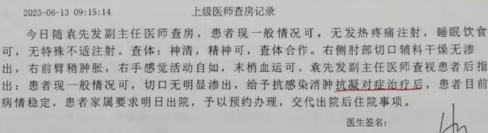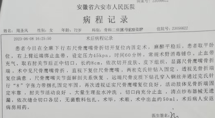 6月8日,周圣凤在全身麻醉下接受右尺骨鹰嘴骨折切开复位内固定术。术中记录详细描述:“直视下复位尺骨鹰嘴,两枚克氏针钻入固定,透视见骨折端复位满意,尺骨鹰嘴关节面解剖关系恢复……‘8’字张力带捆扎固定牢固,再次透视证实复位良好,肘关节活动良好。”术后恢复阶段,老人病情平稳,至6月13日,已明确提出次日出院的申请,彼时的诊疗进程看似一切顺利。