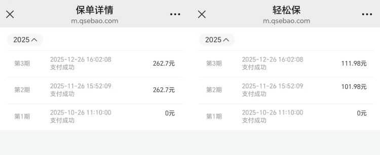 在杨先生提供的投保信息中,上游新闻记者看到,两份保险分别是在轻松保严选平台投保的泰轻松百万守护医疗险(基础版)和泰轻松健康守护重疾险(基础版),承保公司为泰康在线财产保险股份有限公司(以下简称:泰康保险)。投保期为2025年10月27日至2026年10月26日。截至2025年12月26日,两份保险已连续投保3个月,除2025年10月首月费用为0元外,剩余两月共累计支付739.36元保险费。扣费方式均为自动扣费。