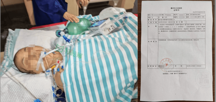 杨先生介绍,2025年10月6日,妻子张某骑电动车回老家探亲时遭遇车祸受重伤。浙江省衢州市人民医院证明书显示,经诊断,车祸造成张某特重型颅脑损伤、右侧额叶脑挫伤脑干损伤、脑肿胀、右侧血气胸、多发肋骨骨折、右侧肩胛骨骨折、皮下积气、腹腔损伤、肠系膜动脉破裂出血、骨盆骨折等多处损伤,同时还出现了呼吸衰竭、失血性贫血、失血性休等症状。
