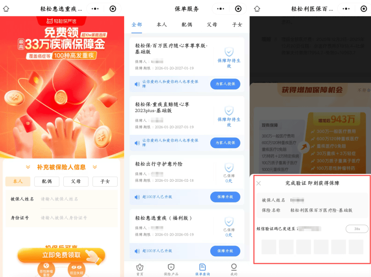 既然是赠险为何会出现扣费的情况?上游新闻记者输入记者本人信息并领取“免费保险”,发现链接会自动跳转至升级版保险连接。在拒绝升级且未绑定任何支付信息的情况下,记者名下已出现了轻松保百万医疗随心享、轻松保重疾直赔随心享、轻松出行守护意外险、轻松惠选重疾险等4份保险,其余2份保险在“免费领取”后分别通过云闪付平台进行了扣费,并开通了自动扣费功能。