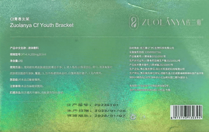 “CF青春支架”备案号为川蓉械备20210097(已于2023年3月注销),由四川半轮医药科技有限公司备案生产,包装明确标注使用方式为“对皮肤或创面进行涂抹、覆盖”,未包含注射用途。在国家药品监督管理局的历史备案中,该产品同样为非无菌提供,预期用途为通过在创面表面形成保护层,起物理屏障作用。