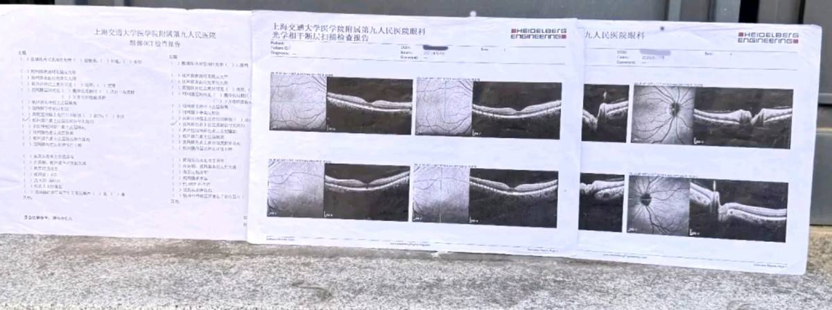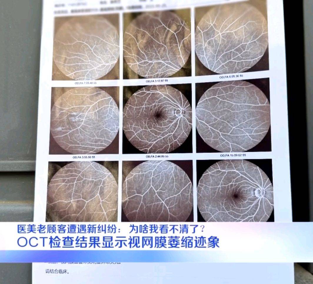 为了查明眼部问题的根源,郭女士在2025年九月初前往上海九院。眼部OCT检查结果显示,视网膜出现了萎缩迹象,此外,在广东中山大学进行的眼底血管造影检查中,医生还发现她的视网膜区域存在明显的小白点和色素沉淀。