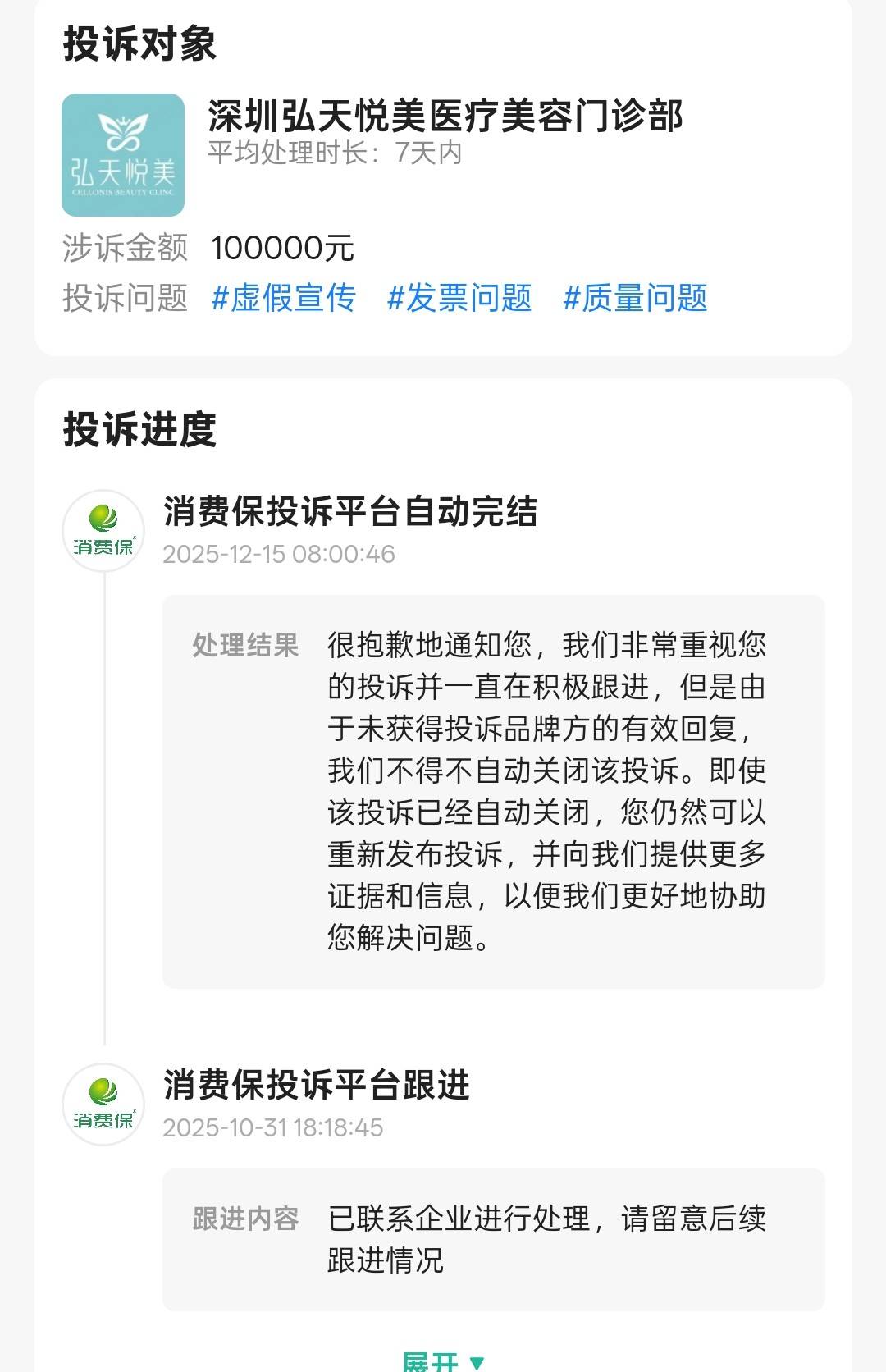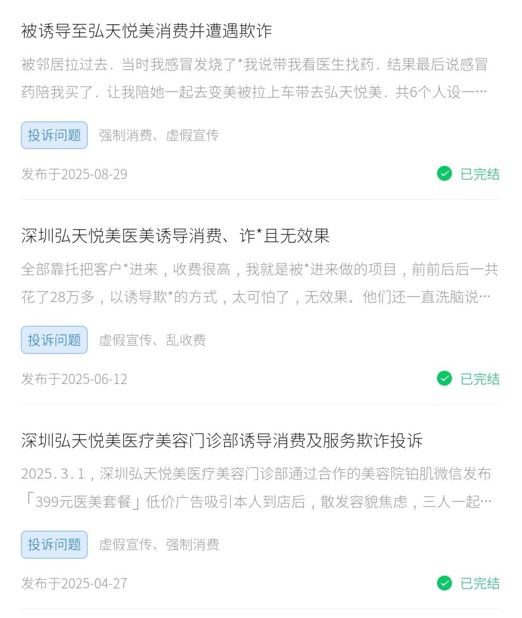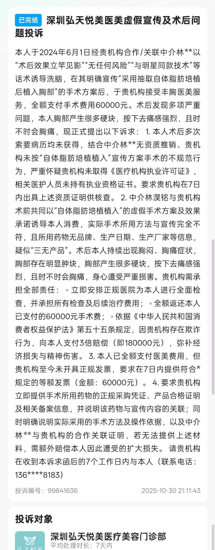 2025年10月30日,有消费者在消费保平台投诉称,其于2024年6月1日经深圳弘天悦美医美机构合作或关联中介林姓人员以“术后效果立竿见影”“无任何风险”“与明星同款技术”等话术诱导,并在对方明确宣传将采用“抽取自体脂肪培植后植入胸部”的手术方案后,在该机构接受丰胸医美服务,全额支付手术费用6万元。