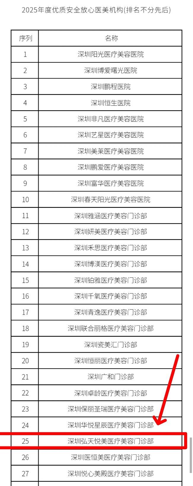 就在1月8日,深圳市整形美容行业协会第三届第四次会长办公会审议通过并公示的“2025年度优质安全放心医美机构(服务商)评比结果”显示,深圳弘天悦美医疗美容门诊部入选“2025年度优质安全放心医美机构(服务商)”。