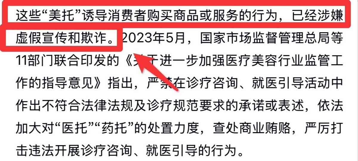 2023年5月,国家市场监督管理总局等11部门联合印发的《关于进一步加强医疗美容行业监管工作的指导意见》明确指出,严禁在诊疗咨询、就医引导活动中作出不符合法律法规及诊疗规范要求的承诺或表述,并依法加大对“医托”“药托”的处置力度。
