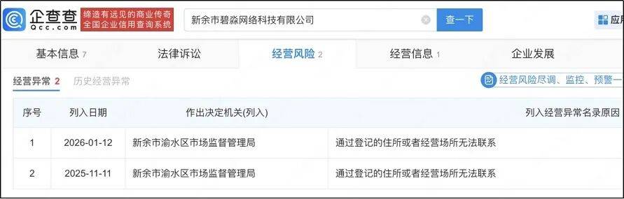 工商信息显示,碧淼网络2025年6月成立,注册资本100万元,经营范围为信息技术咨询服务、互联网销售等。因通过登记的住所或者经营场所无法联系,碧淼网络近期已两度被新余市渝水区市场监督管理局列入经营异常名录。也就是说,碧淼网络很可能只是一个壳公司。