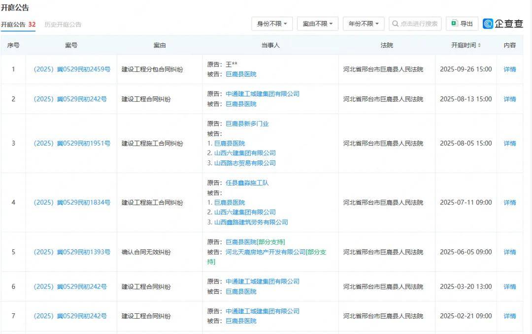 此外,据企查查公开信息显示,巨鹿县医院近一年来官司“缠身”,涉及多起司法案件,且以民事案件为主,案由包括建设工程分包合同纠纷、建设工程合同纠纷、建设工程施工合同纠纷、确认合同无效纠纷等。