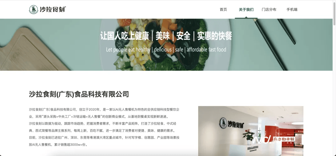 据沙拉食刻官网介绍,其创立于2020年,总部位于广东东莞道滘,是一家以AI无人售餐机为特色的全供应链科技型餐饮企业,已进驻穗深莞等粤港澳大湾区城市,针对写字楼、产业园等场景投放AI无人售餐机。