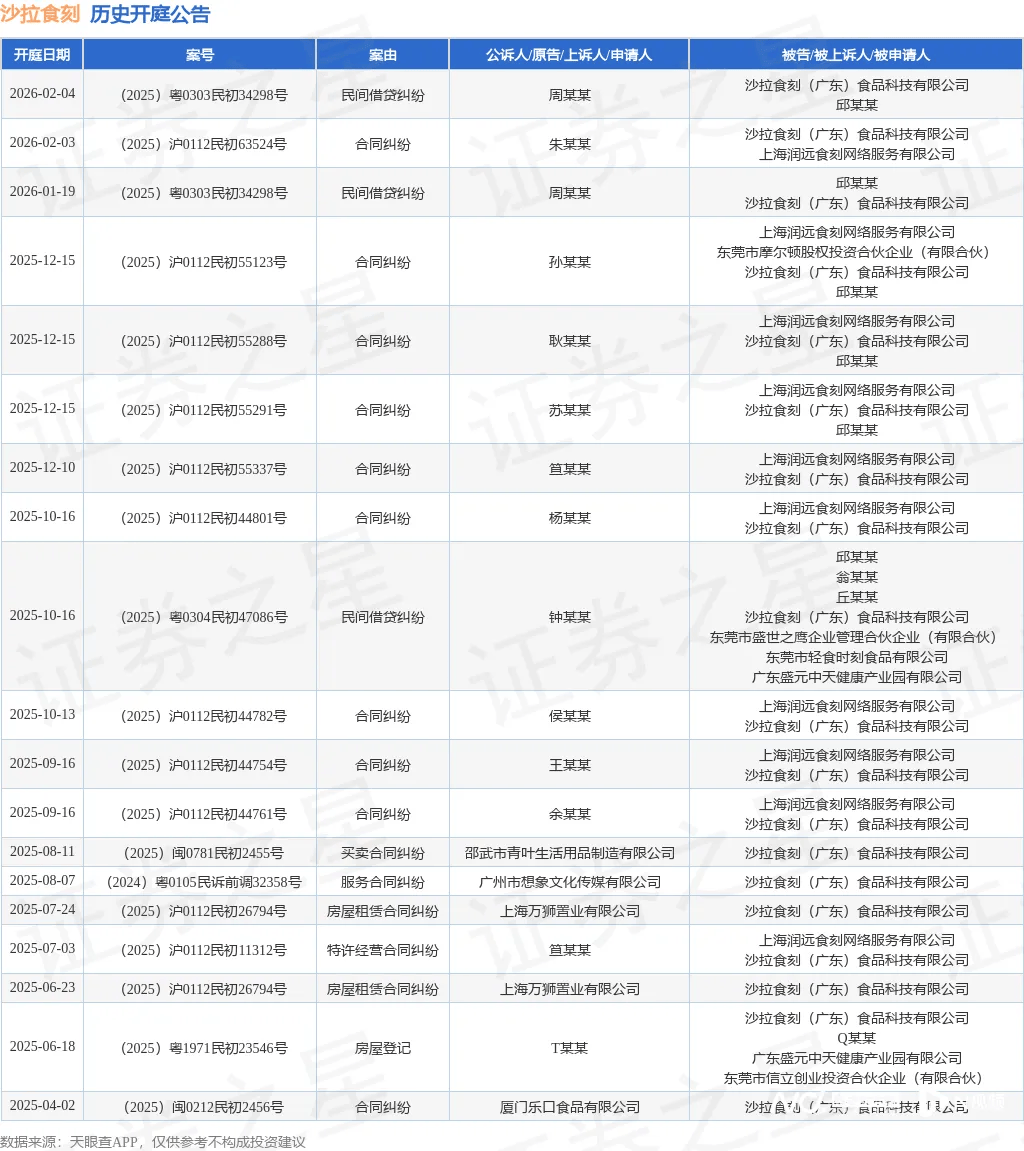 据天眼查App,2026年1月6日,东莞市第一人民法院要求被执行人沙拉食刻食品科技有限公司履行义务,被执行总金额为10.55万元。此外,2025年12月24日,深圳市福田区人民法院将深圳厨易时代食品科技有限公司列为被执行人,被执行总金额为1.69万元。